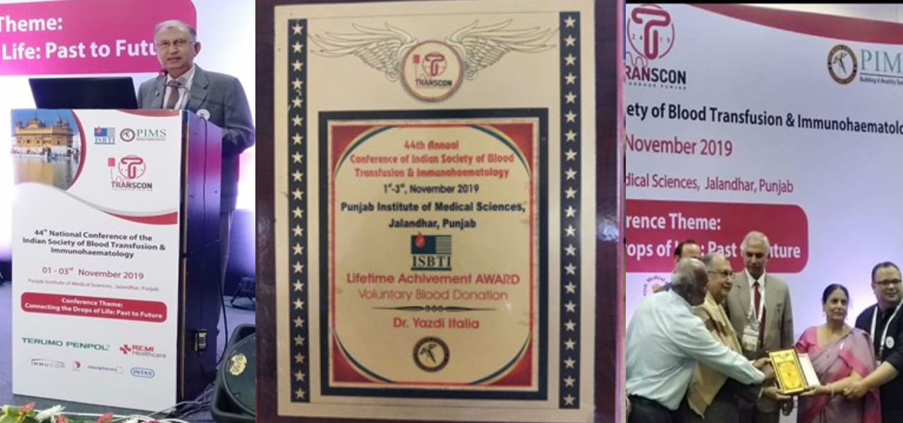 Dr. Yazdi Italia was honored with the Lifetime Achievement Award at the 44th National Conference of the Indian Society of Blood Transfusion & Immunohematology (ISBTI) — Transcon 2019.
