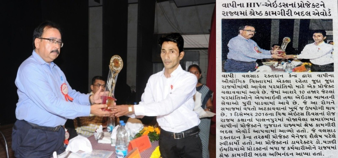 Valsad Raktdan Kendra was honored with the Star Performance Award (2016) by the Gujarat State AIDS Control Society (GSACS) for delivering the best Targeted Intervention (TI) Program among Female Sex Workers (FSW), Men who have Sex with Men (MSM), and Single Migrant Industrial Workers.